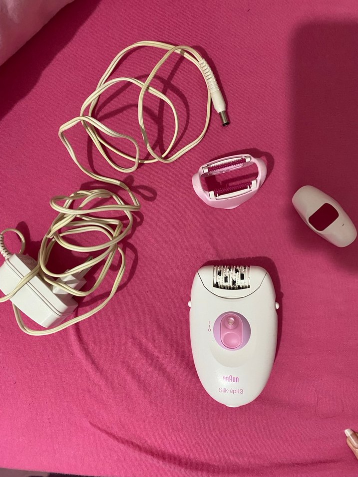 Pembe Braun Silk-épil 3 epilatör, ana cihaz, güç adaptörü, temizleme fırçası ve çeşitli başlıklarla birlikte gelir. Kablolu güç kaynağı ile çalışır. Çok az kullanılmıştır tertemiz sorunsuz çalışır✨