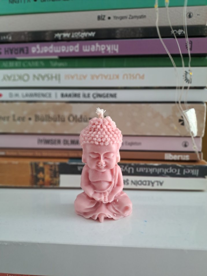 Meditasyon yapan Buddha şeklinde, pastel pembe renkte dekoratif bir mum. ️İstenilen renklerde yapılır.