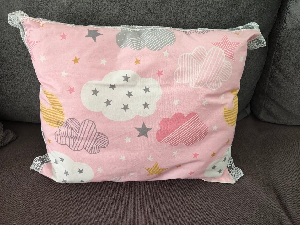 Bu çocuk yastığı, pembe zemin üzerinde bulut ve yıldız desenlerine sahip, sentetik kumaştan yapılmıştır ve yumuşak dokuludur.