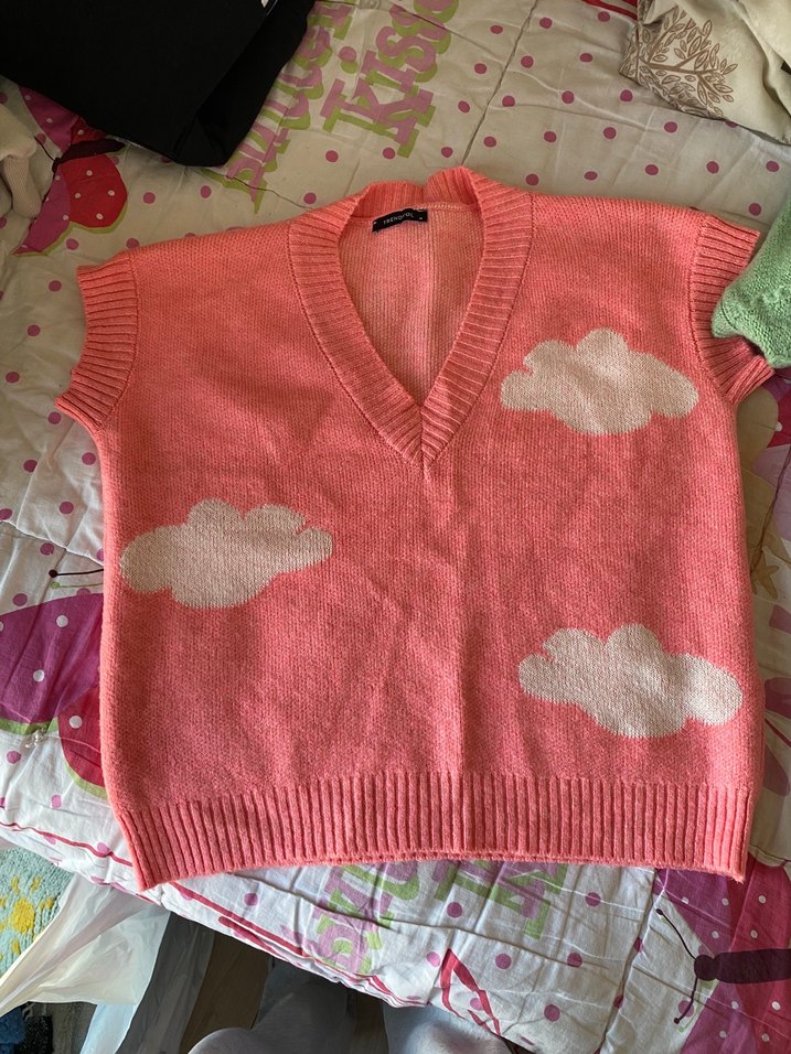 Pembe renkte, beyaz bulut desenli, V yaka ve kolsuz triko süveter, rahat ve salaş kesime sahiptir. ️