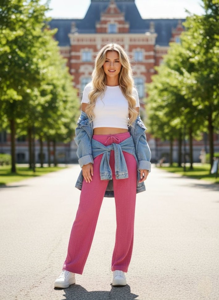 Bürümcük kumaş, açık pembe renkte, bol kesim kadın pantolonu. Rahat sokak stili için uygundur. S-m bedenleri mevcuttur