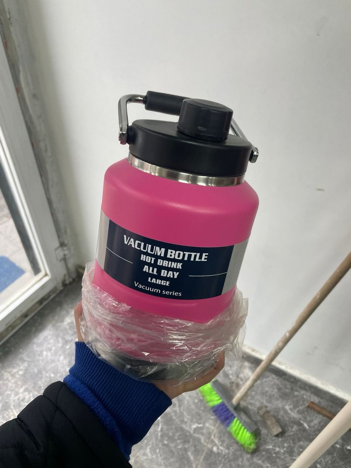 Renkli pembe büyük vakum şişe, içecekleri gün boyu sıcak tutar. Güvenli kapak ve taşıma sapı bulunur. Çocuklar için uygun.