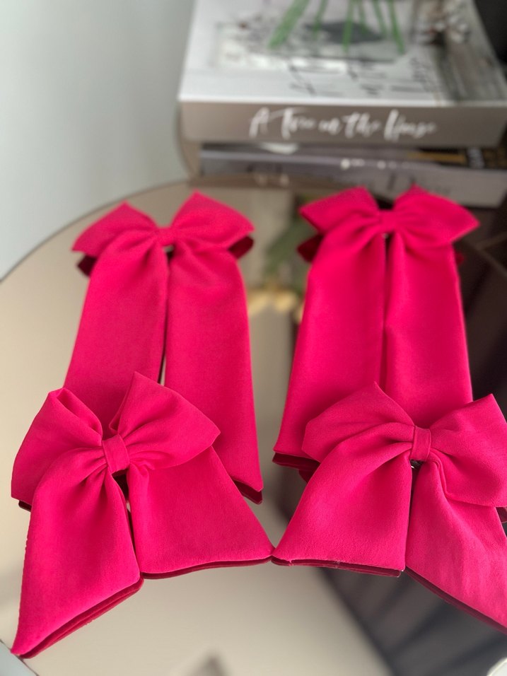 Canlı pembe renkte, yumuşak sentetik kumaştan yapılmış büyük fiyonk saç aksesuarları, çağdaş Paris tarzına uygun.