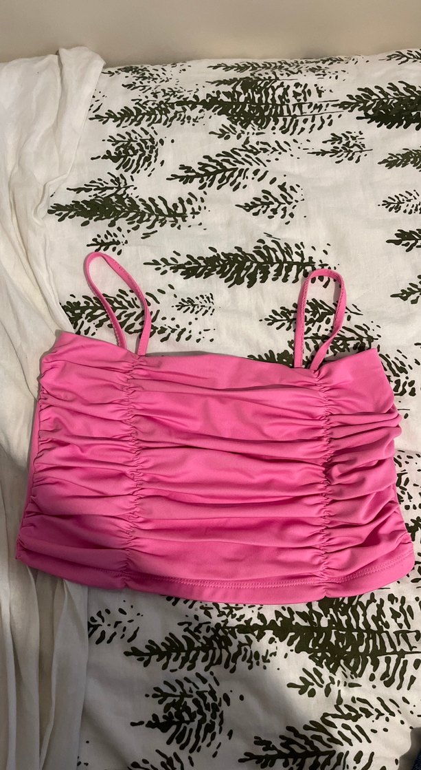 Pembe renkli, büzgülü ve askılı kısa mini crop, sentetik kumaştan, pastel tonlu batik desenli, dış mekan sokak stili için uygun.