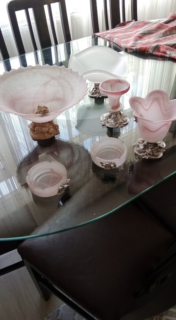 Açık pembe çağdaş tarzda, gümüş tonlu çiçek detaylı tabak ve vazolar içeren dekoratif masa takımı.