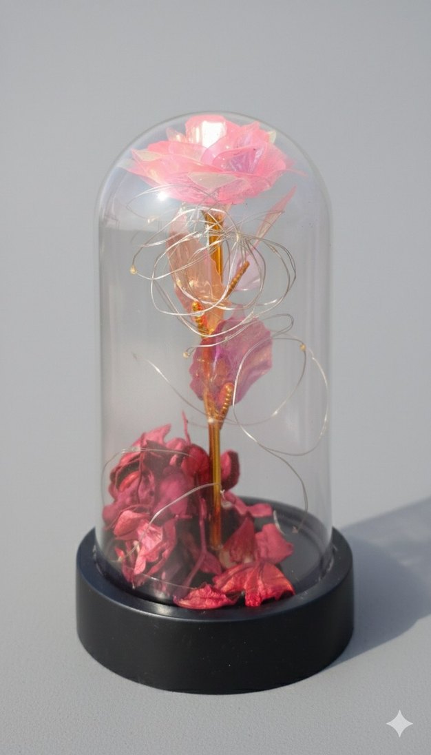 Pembe Cam Fanus İçinde Dekoratif Ledli Gül