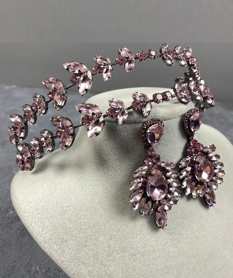 Koyu pembe cam taşlarla süslenmiş, ışıltılı ve çağdaş tasarımda saç aksesuarı seti, moda öncülerine uygun.