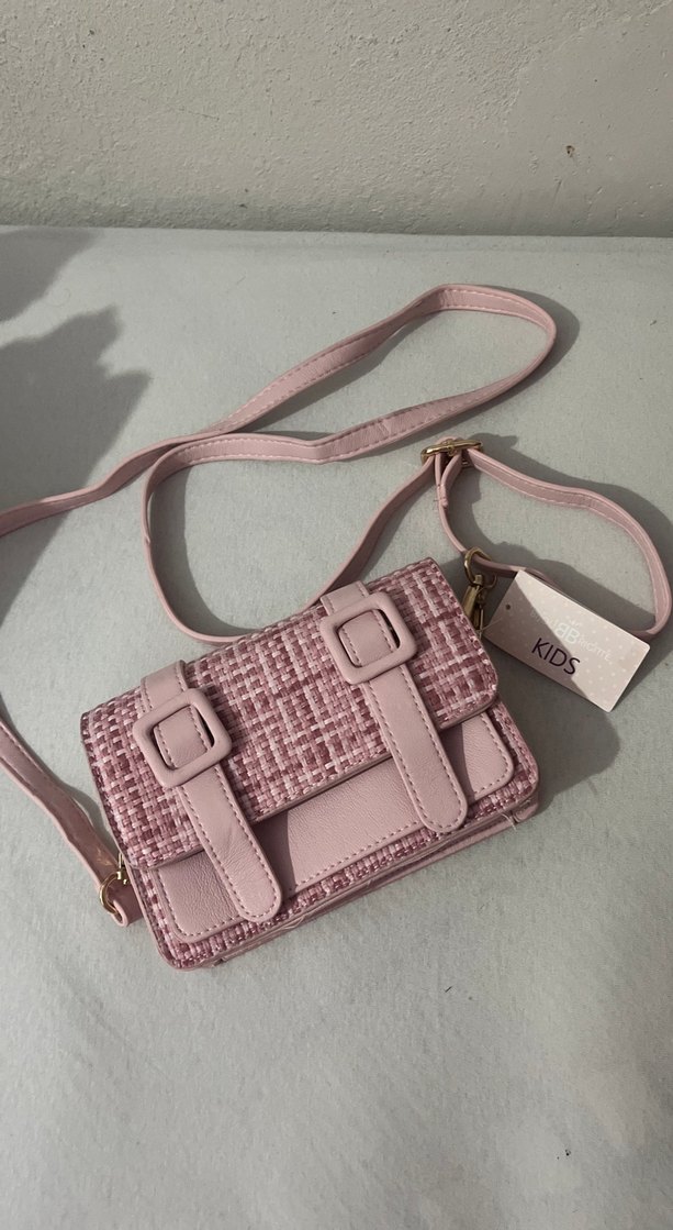 Pastel pembe renkte, nakışlı ve tokalı detaylara sahip kadın çantası. Sentetik kumaştan üretilmiş, günlük kullanım ve sokak stili için uygun. küçük
