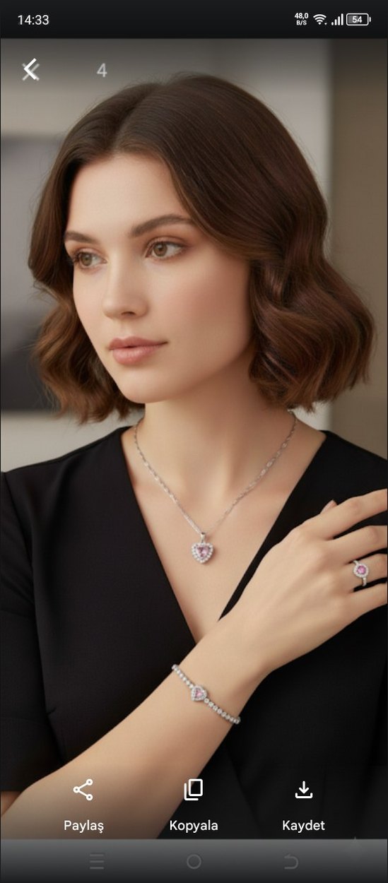 Kadınlar için pembe baskılı payetli kalp figürlü kolye, bileklik ve yüzük seti, romantik akşamlar için uygundur.