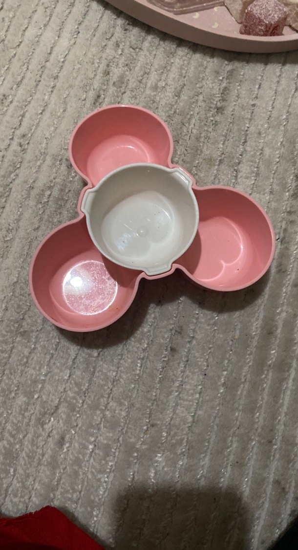 Pastel pembe renkli, çocukların yiyeceklerini ayırması için üç bölmeli tabak seti. ️