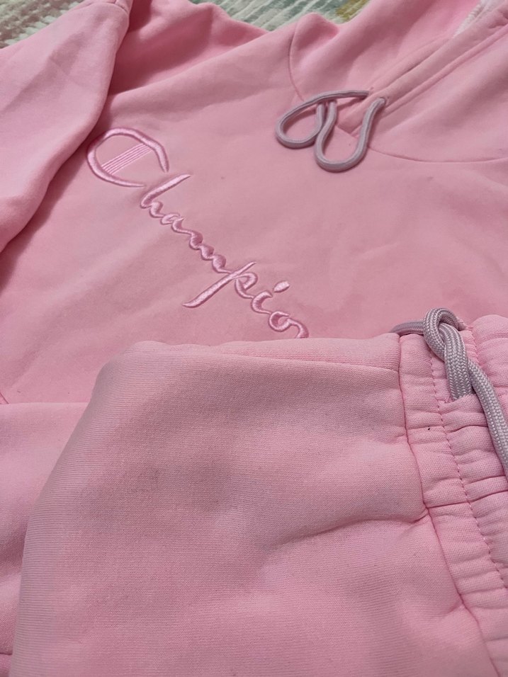 Rahat kesim, kapüşonlu yakalı, pembe Champion eşofman takımı. Yumuşak ve sıcak kumaştan, trend sokak stiline uygun. (Orijinal ürün değildir)