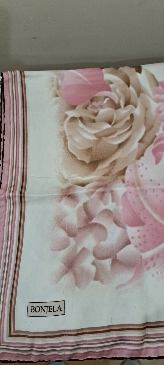 Pastel pembe renkli, çiçek baskılı ve çizgili detaylara sahip yumuşak dokulu ipek