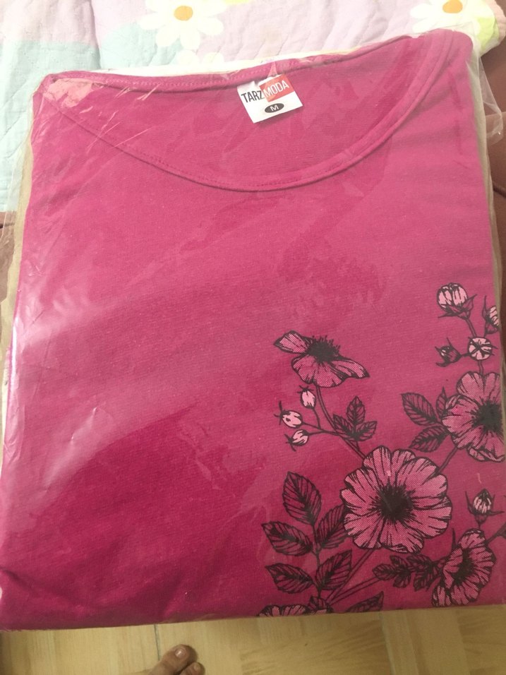 Pembe renkte, siyah çiçek baskılı, kısa kollu ve yuvarlak yaka tişört.Yumuşak sentetik kumaştan, rahat kesim, günlük kullanım için uygun.