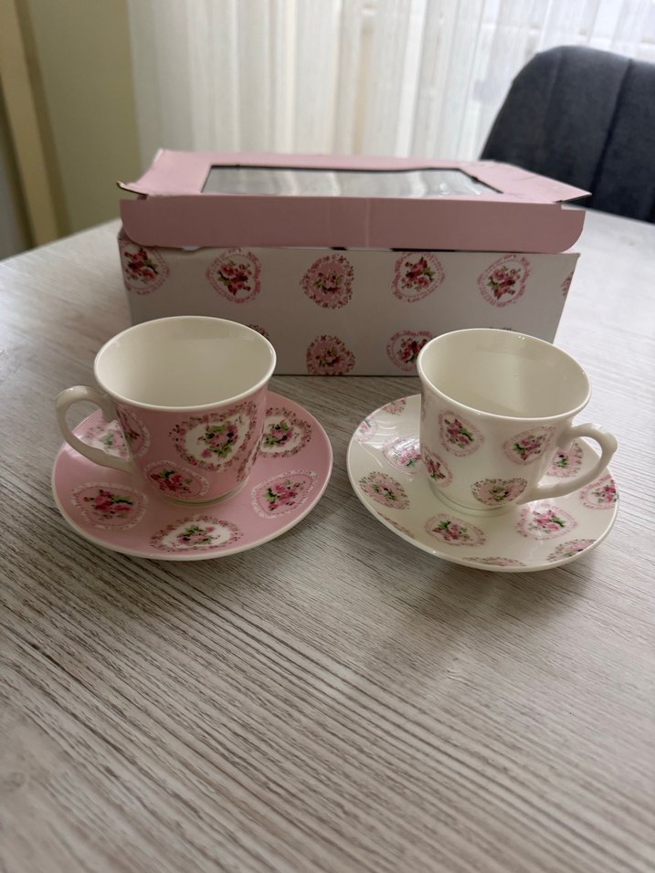Pastel pembe renkte, çiçek desenli iki fincan ve tabak seti. Hiç kullanılmadı.