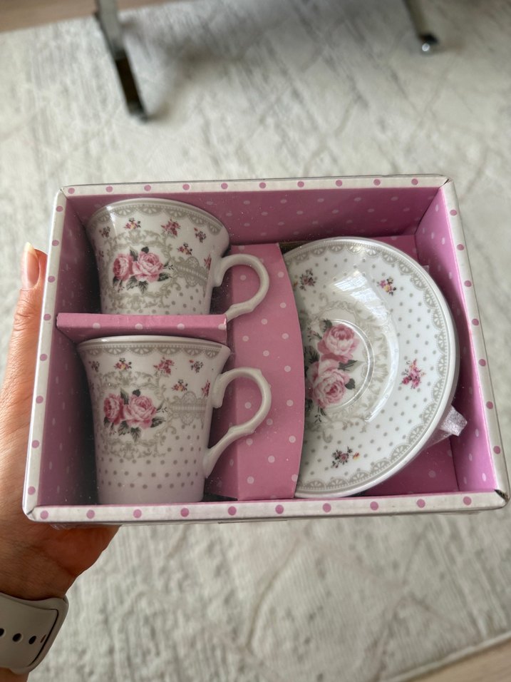 İki adet kahve fincanı ve tabakları, pembe gül ve çiçek desenleriyle süslü. Hiç kullanılmadı, herhangi bir kırık/defo yok, kendi paketiyle gönderilecek. Hediye için zarif ve uygun bir seçenek.