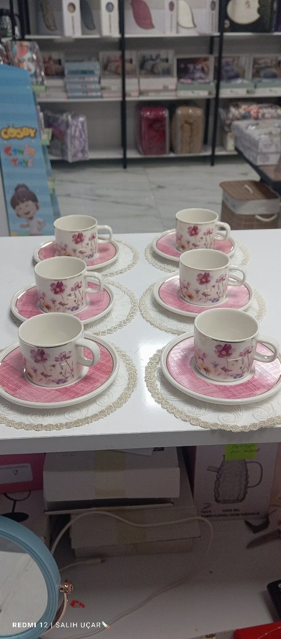 Pastel pembe renkte, çiçek desenli 6 adet fincan ve tabak takımı. Çay veya kahve servisleri için uygundur.