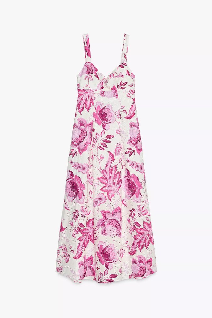 Pembe çiçek desenli, dantel detaylı askılı uzun elbise. Bohem tarzda, regular fit ve straplez yakalı.
