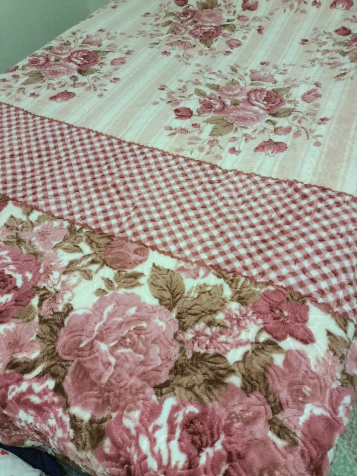 Pastel pembe çiçek desenli, kareli bordürlü yumuşak dokulu tek kişilik battaniye az kullanilmis