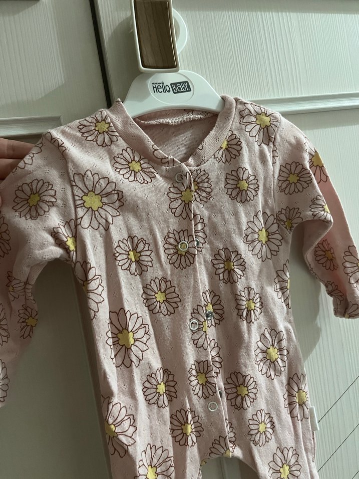 Pastel pembe renkli, çiçek desenli ve düğmeli bebek kız tulumu.
