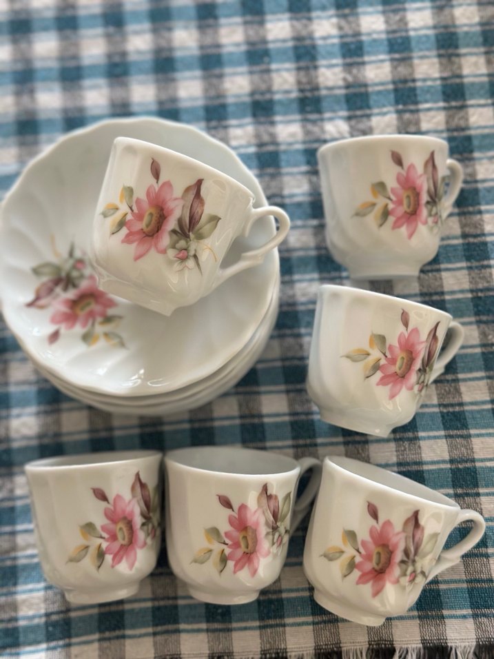 Pembe çiçek desenli beyaz porselen fincanlar ve tabaklardan oluşan takım. Her fincanın kulpu ve zarif çiçek motifleri vardır.