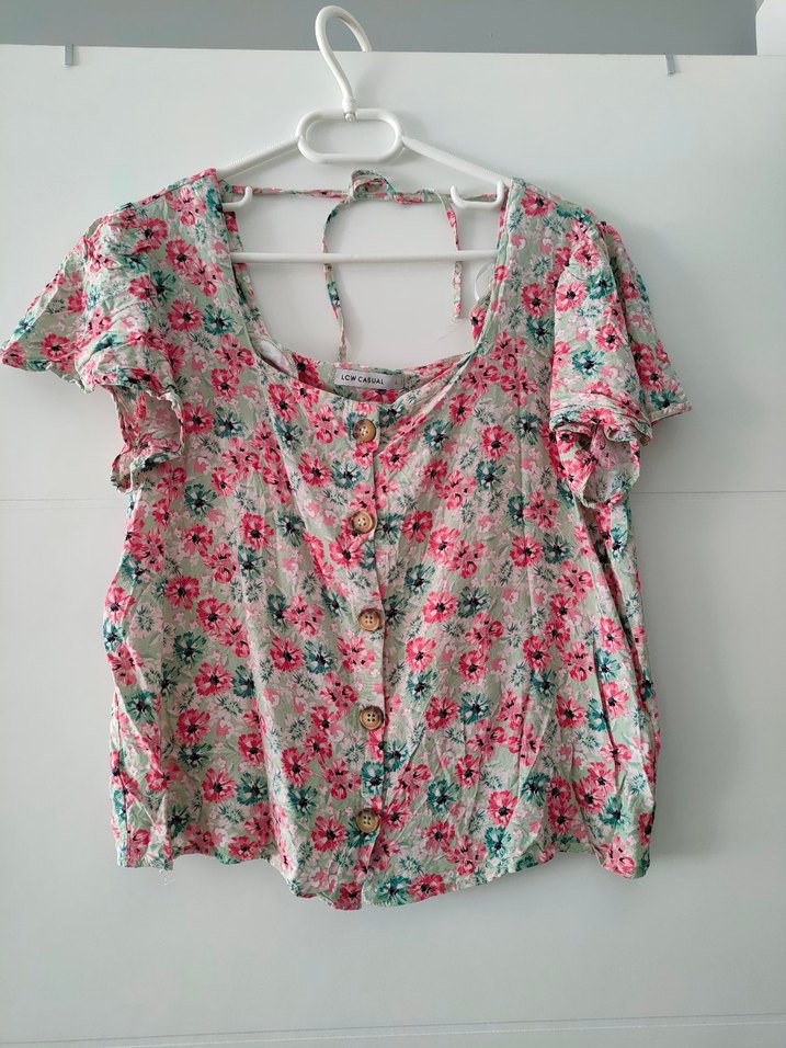 Pembe tonlarda, kısa kollu ve kare yaka çiçek desenli bluz. Bedeni L herhangi bir defosu yoktur ihtiyaç fazlası olduğu için satışta