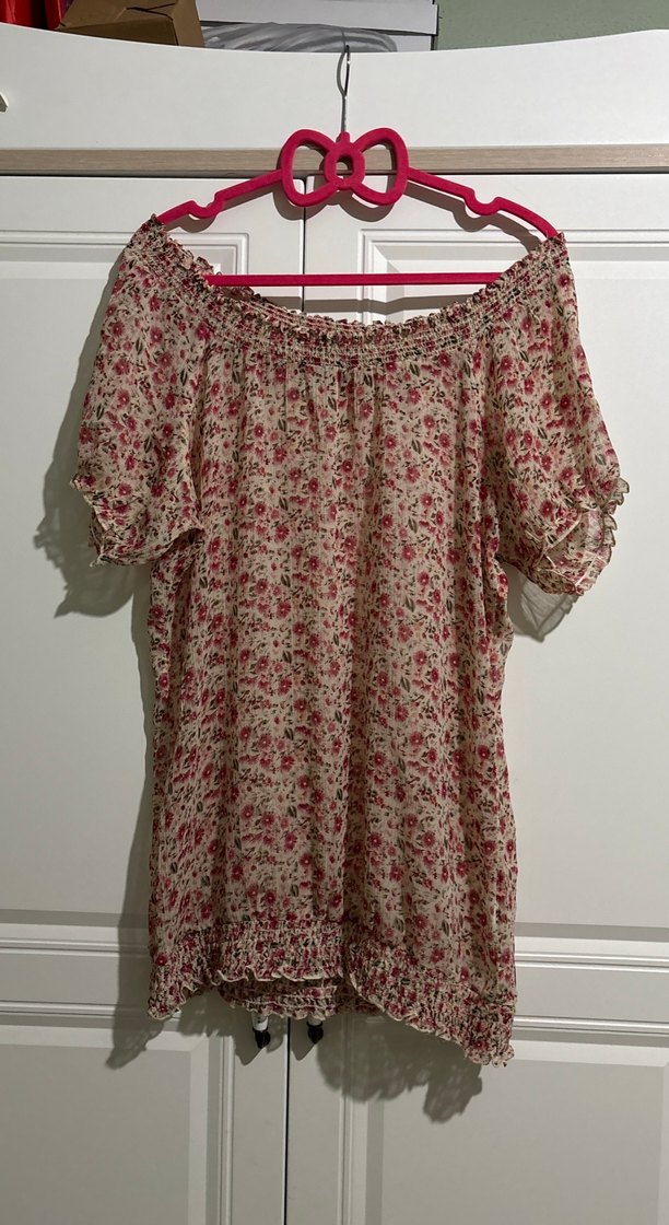 Pembe Çiçek Desenli Bohem Bluz omuz açık