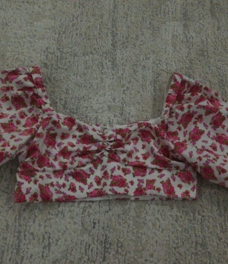 Bu kadın bluz, tekne yaka ve askılı kollarıyla, volan detaylıdır. Yumuşak sentetik kumaş üzerine pembe çiçek desenine sahiptir ve kısa boydadır.