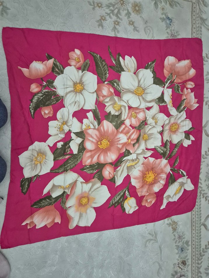 Pembe renkte, renkli çiçek desenli, yumuşak sentetik kumaştan yapılmış, bohem vintage tarzda drapeli kadın fular.