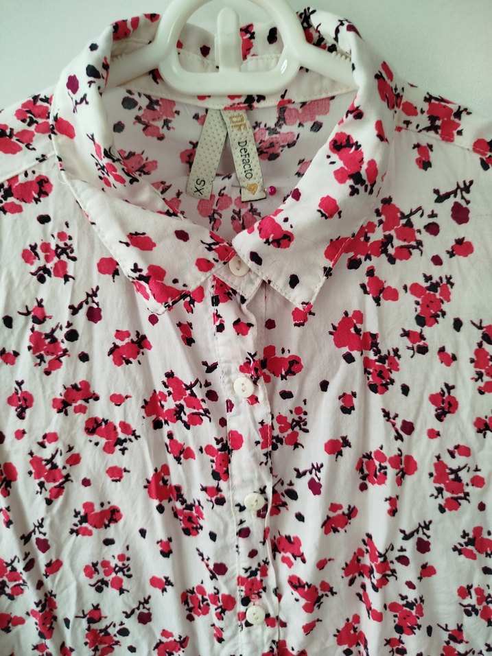 Pamuk kumaştan, düğmeli ve yakalı, açık pembe zemin üzerine baskılı çiçek desenli bol kesim bohem kadın gömleği. Kısa kollu ve normal boyda, günlük kullanıma uygun.
