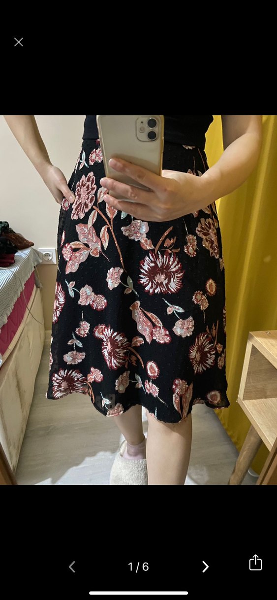 Sentetik kumaştan, çiçek desenli ve drapeli tasarıma sahip, bol kesim pembe midi etek. Bohem tarzı için uygundur.