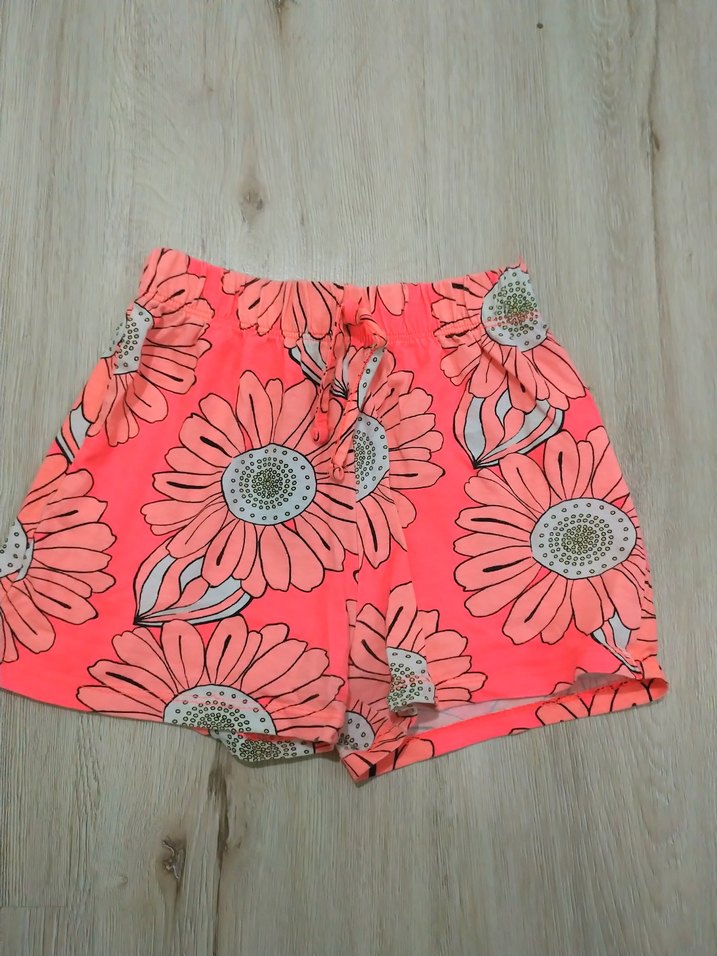 Sentetik kumaştan, renkli pembe çiçek desenli, dantelli, bol kesim mini şort. Bohem tarzı ve açık hava için uygun.