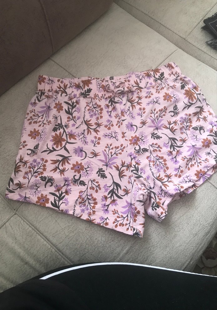 Pembe, pastel çiçek desenli, dantel detaylı, yumuşak sentetik kumaştan bol kesim mini şort. Bohem tarzı için uygundur.