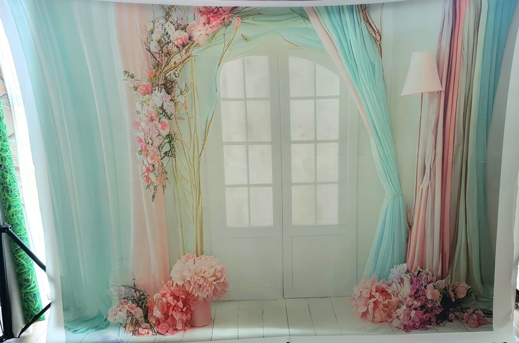 Pastel pembe, çiçek desenli bohem tarzda perde, mekana yumuşak ve şık bir dokunuş katıyor.