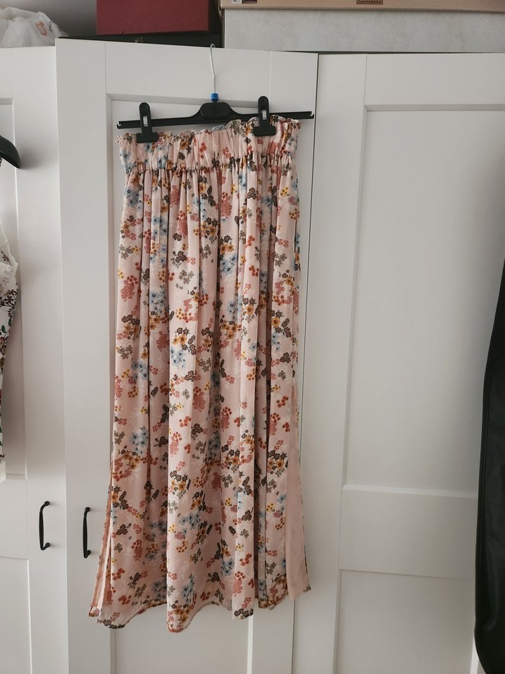 Pembe renkli, yumuşak sentetik kumaştan yapılmış, bol kesim ve drapeli, pastel çiçek desenli bohem uzun etek.iki yanında da dize kadar yırtmaçları mevcut.