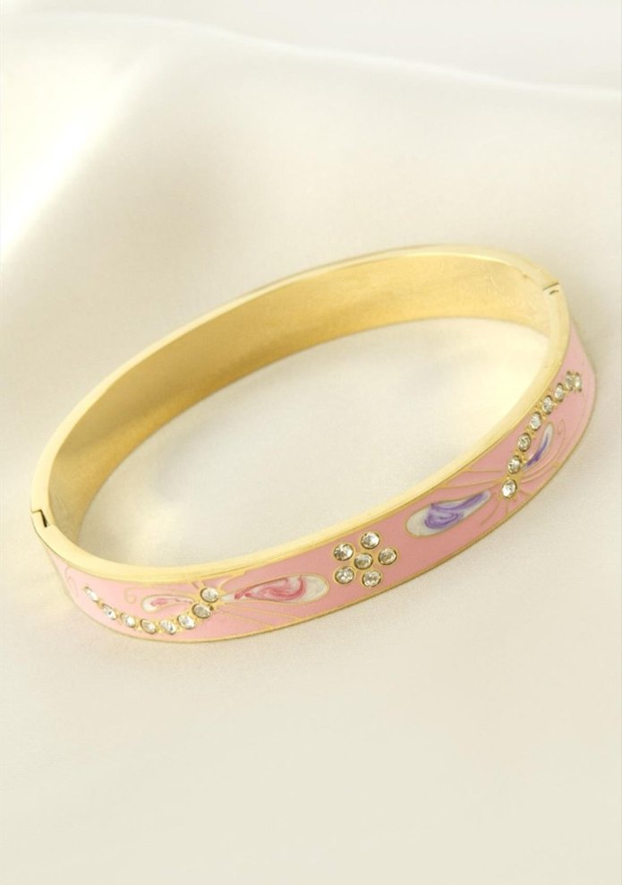 Pastel pembe taban üzerine çiçek desenleri ve boncuk detaylarıyla süslenmiş çağdaş kadın bilekliği, düğünler için uygundur.
