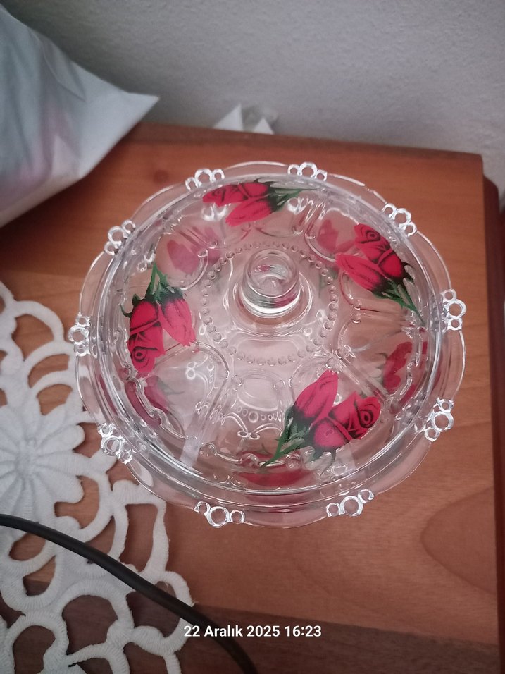 Pembe tonlarında, kırmızı güllerle süslenmiş cam kapaklı tabak. Geleneksel tarzda, kenarları dekoratif detaylı. Üzerinde '22 Aralık 2025 16:23' tarihi bulunur.