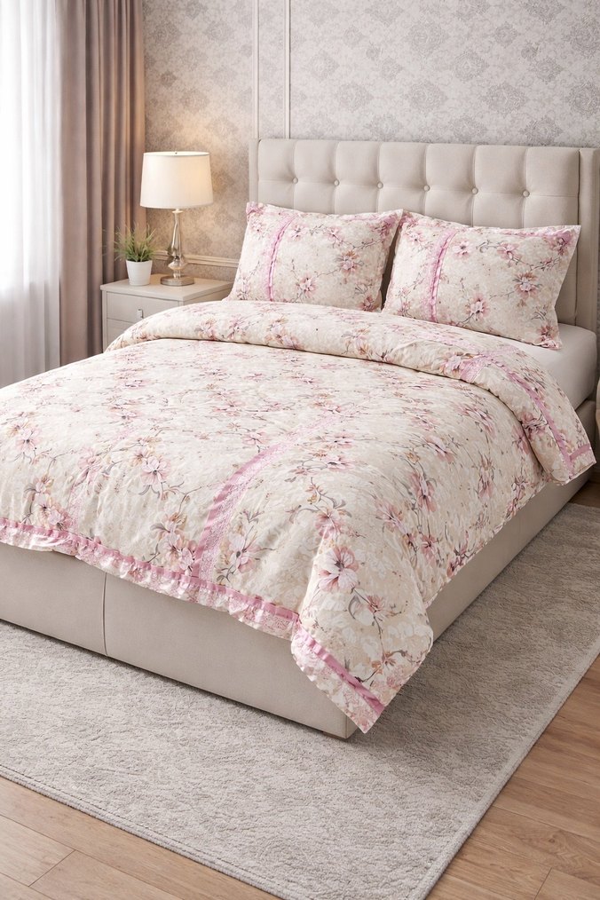 Pembe Çiçek Desenli Çift Kişilik Nevresim Takımı