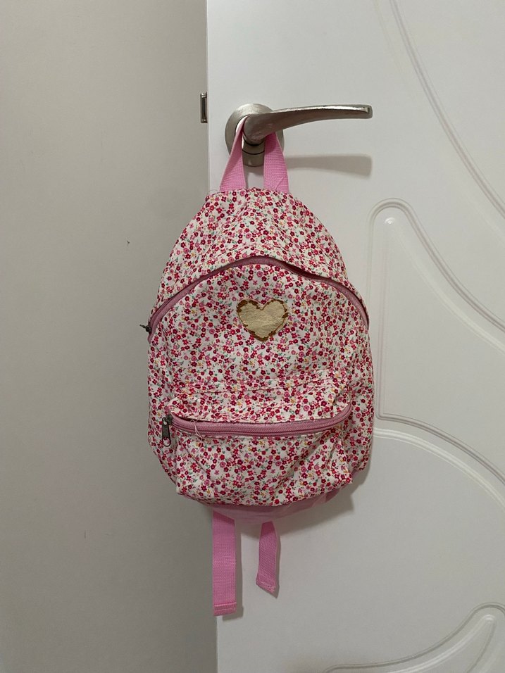 Lc waikiki Pembe renkli okul çantası, renkli çiçek deseni ve ön cepte kalp şeklinde bir detay taşır. Ayarlanabilir askıları ve fermuarlı ön cebi vardır.