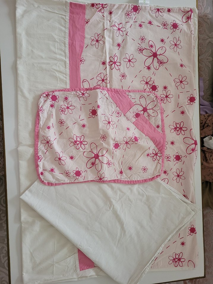 Pastel pembe ve beyaz renklerde, çiçek desenli çocuk uyku seti. Yumuşak sentetik kumaştan yapılmış nevresim takımı