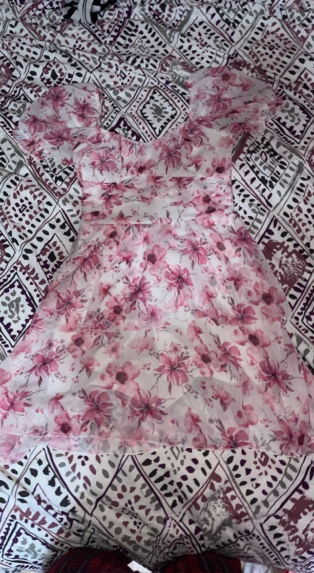 Pembe pastel çiçek desenli, dantel detaylı, kısa kollu ve uzun boy kadın elbisesi. Bohem tarzda, vücuda oturan kesime sahip. Alt kısmı içerden şortludur.