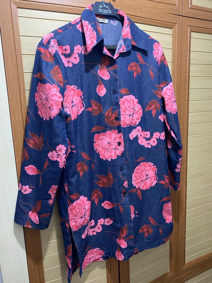 Pembe çiçek desenli denim gömlek, düğmeli ve çentikli yakalıdır. Uzun kollu, bol kesim ve midi boyda, günlük bohem tarzda kullanıma uygundur. Hiç giyilmedi