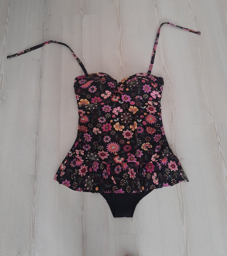 Fırfırlı etek ucu ve ince askılarıyla, koyu pembe çiçek desenli, bohem tarzda kısa kesim mayo. Plajda rahat kullanım sağlar. Göğüs olcusu 90 dir
