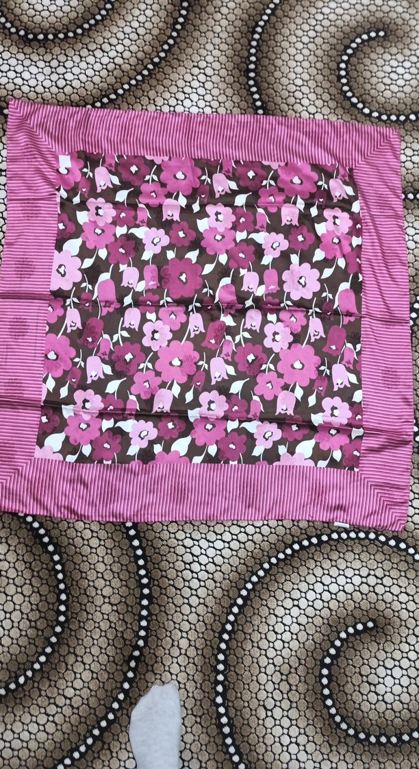 Kadın fuları, koyu pembe çiçek desenleri ve fırfır detaylarıyla, yumuşak sentetik kumaştan bohem tarzda tasarlanmıştır.