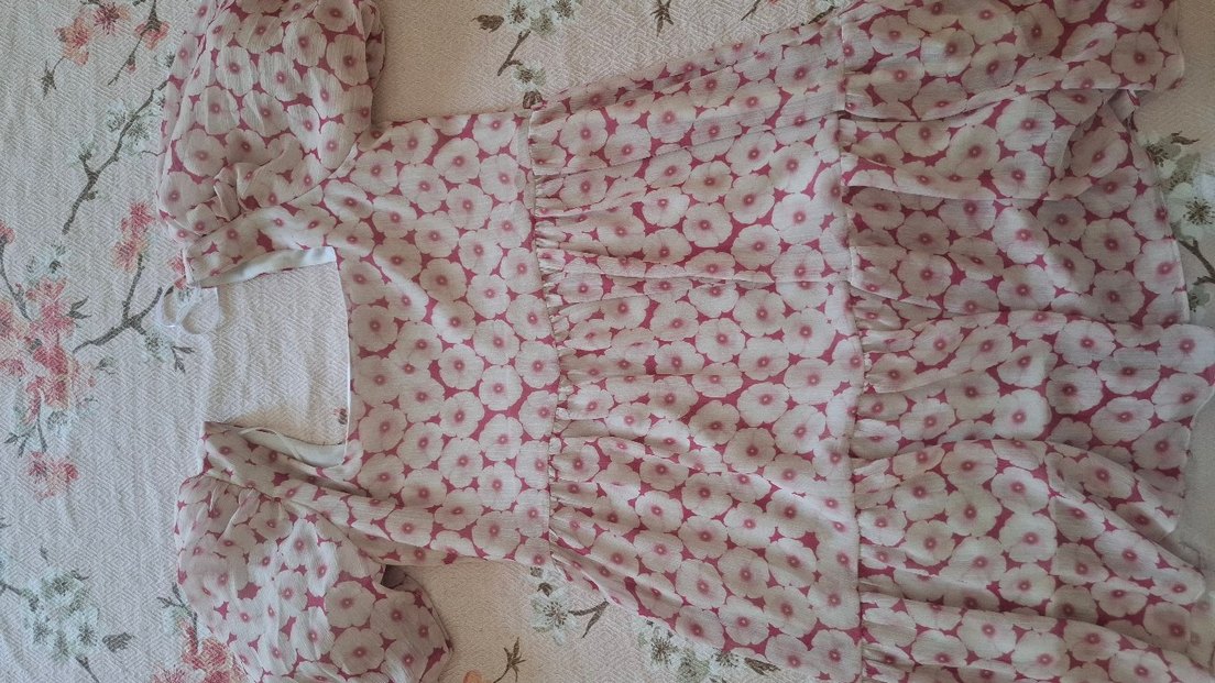 Pembe çiçek desenli, fırfırlı detaylı, kayık yakalı ve askılı, bol kesim kız elbisesi. Yumuşak tekstil kumaştan yapılmıştır.