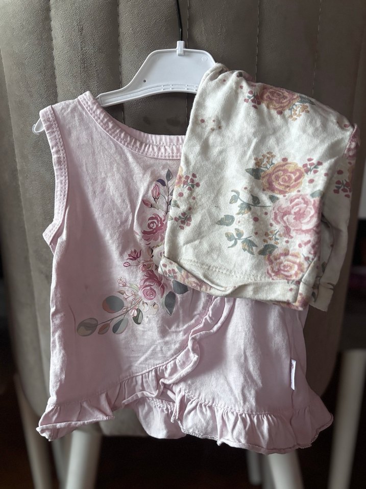 Pembe pastel tonlarında, çiçek baskılı ve fırfırlı detaylara sahip kolsuz bebek kıyafeti seti. Üst ile uyumlu çiçek desenli alt parçayı içerir.