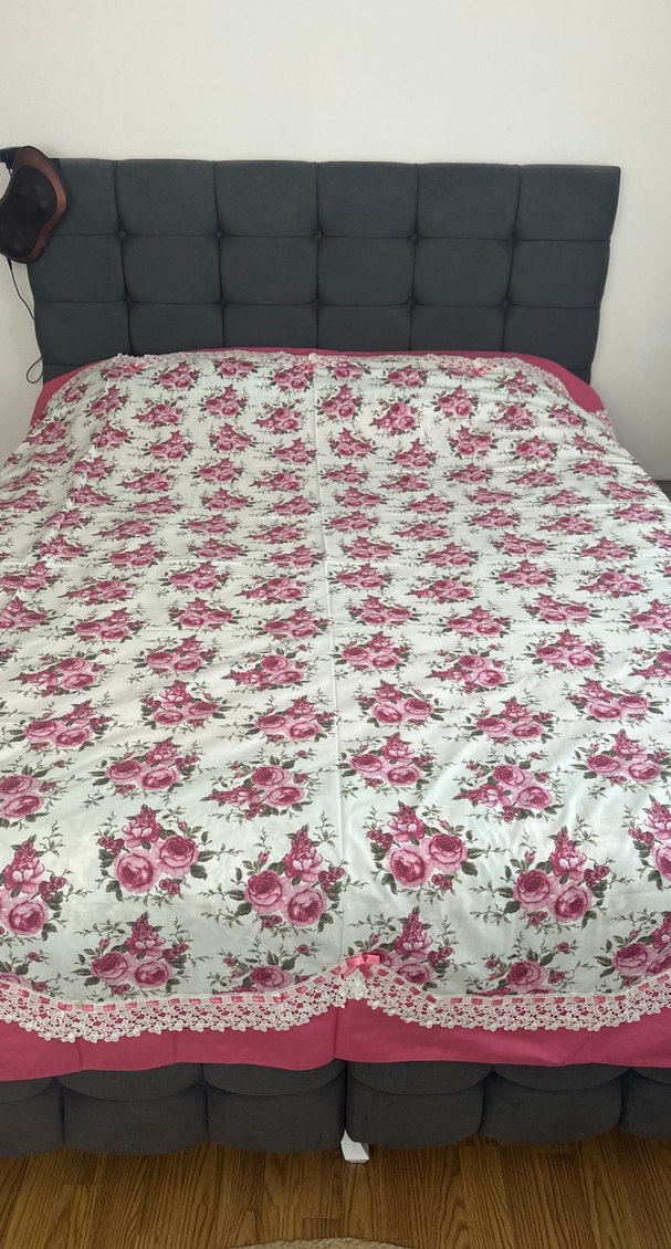 Pembe çiçek desenli, dantel detaylı yatak örtüsü. Gri tuşeli başlıkla tamamlanmış, yumuşak ve konforlu kumaş. Özel olarak yapılmıştır