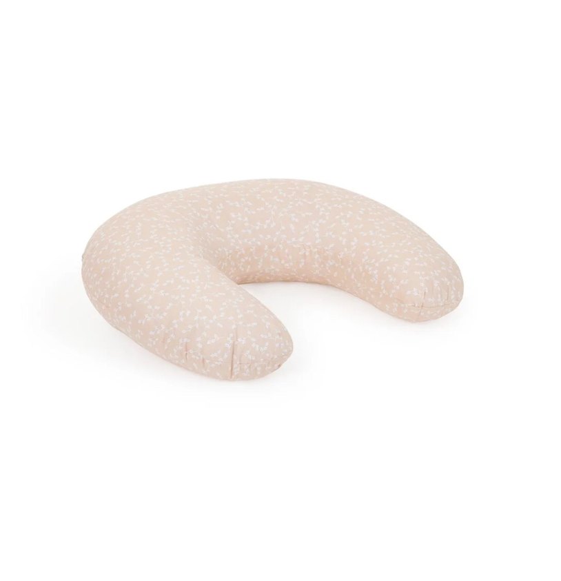 Pastel pembe renkli, yumuşak kumaştan yapılmış çiçek desenli hamile ve emzirme yastığıdır.