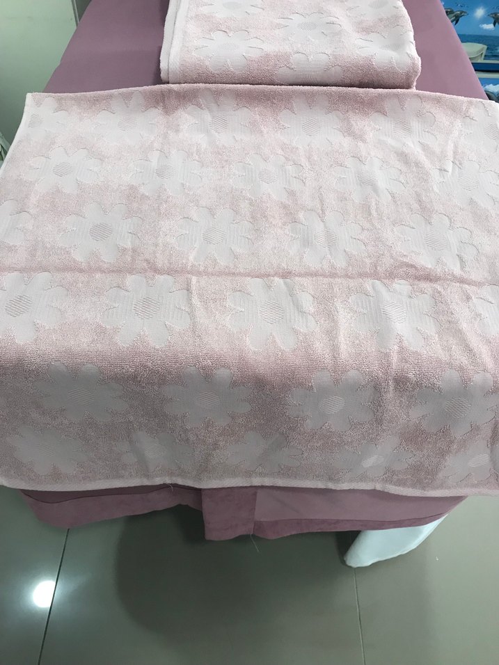 Pembe renkte, çiçek desenli kabartmalı yumuşak dokulu havlu en 70 boy 140