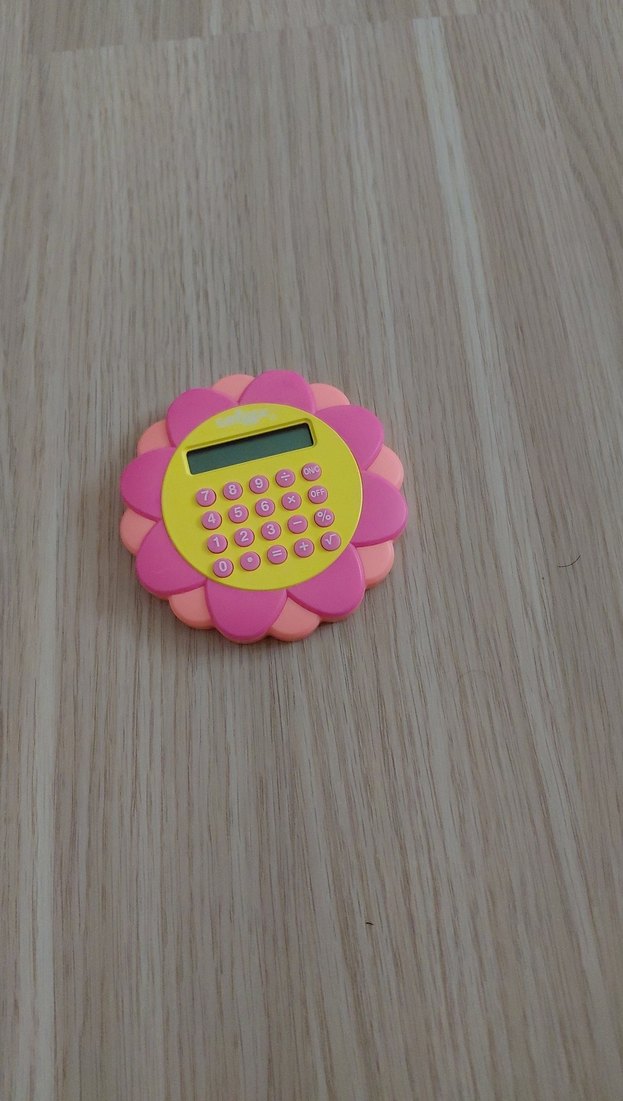 Renkli pembe çiçek şeklinde hesap makinesi, kolay kullanımlı butonlarla masaüstü için uygundur.Pili takarsanız çalışır.Kız çocuk,ders,matematik,hesaplama,süs