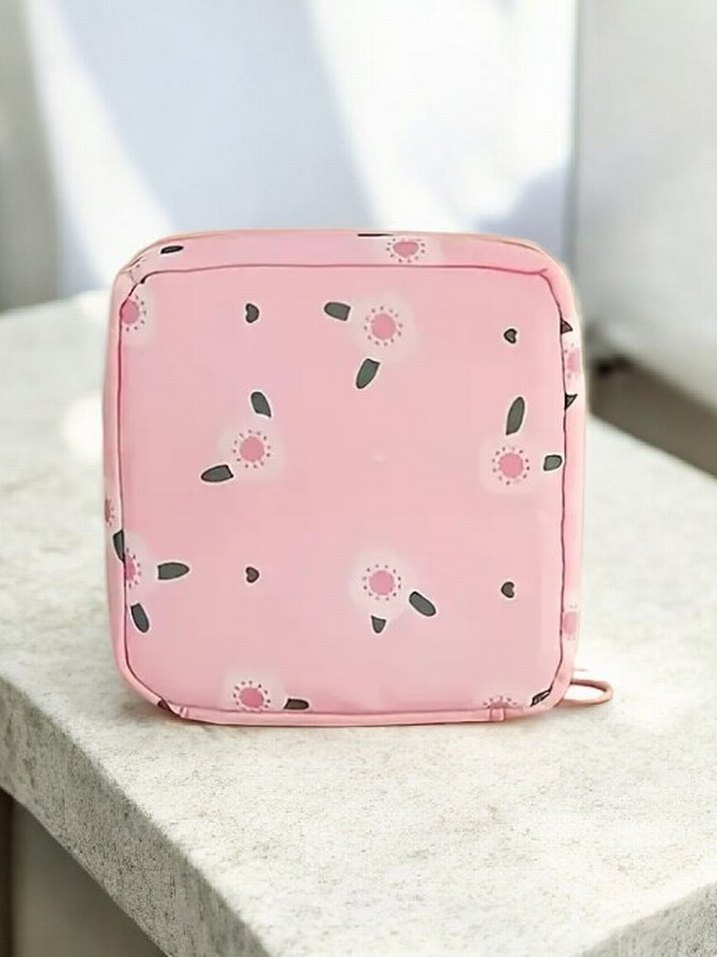 Pembe Çiçek Desenli Kadın Makyaj Ped Çantası